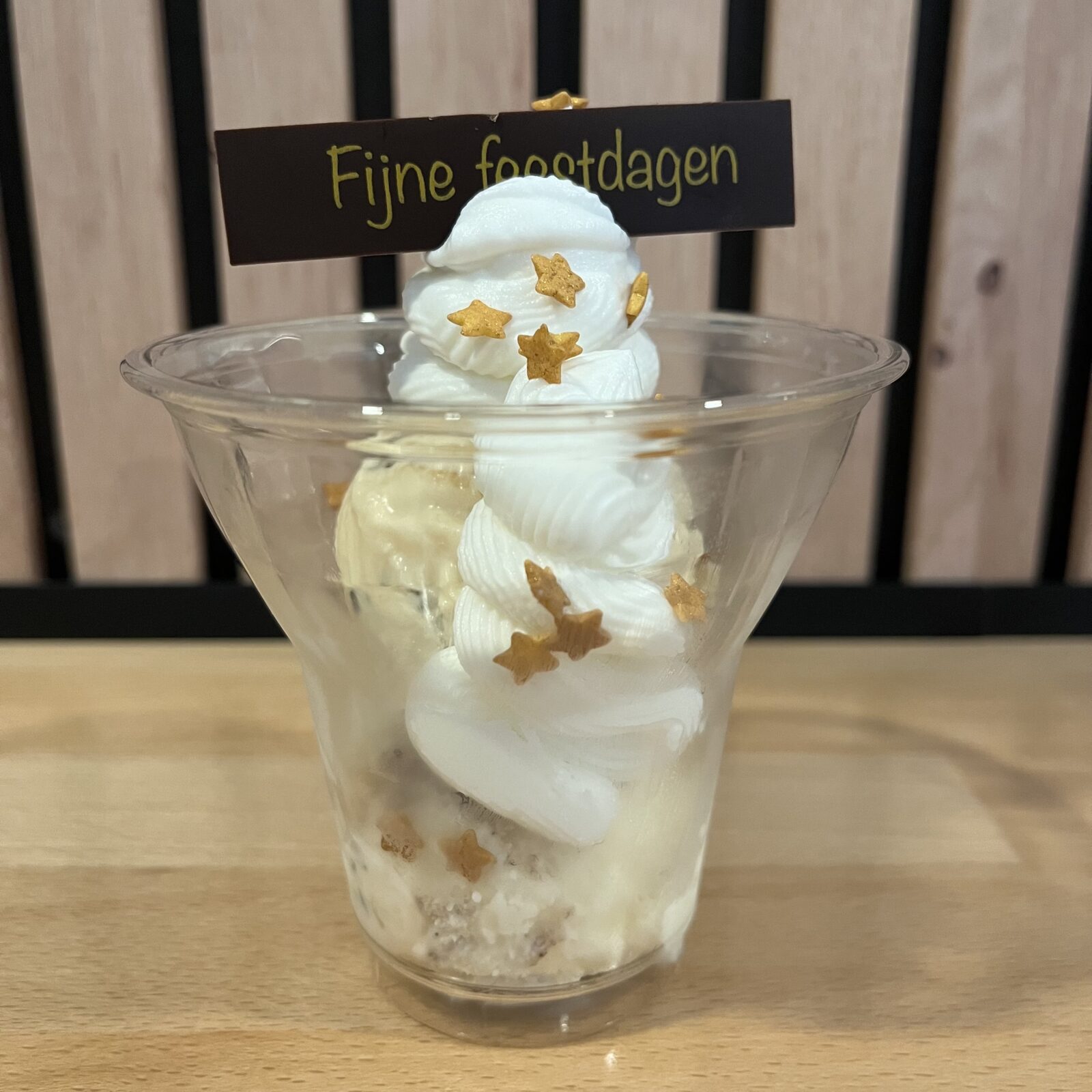 1 bol karamel zeezout ijs en 1 bol oreo ijs, afgetopt met een luchtige room en kerstversiering.